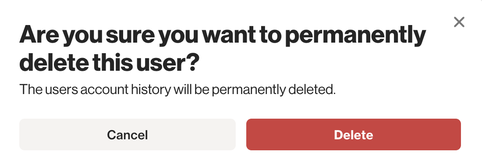 CAUTION: Deleting a user is a permanent action that will remove the user's account history. While version history changes related to this user will still be retained in any associated Journeys, all activity logs from the user will no longer be accessible. Please note that this action cannot be undone.
