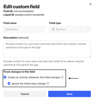 Ortto allows field activity tracking for system, custom, and data source fields, except for multi-select or aggregate type fields.
