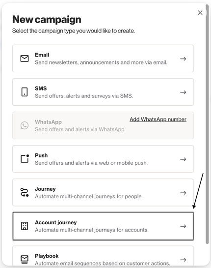 To access Account journeys, go to Marketing > Campaigns > New campaign > Account journey.