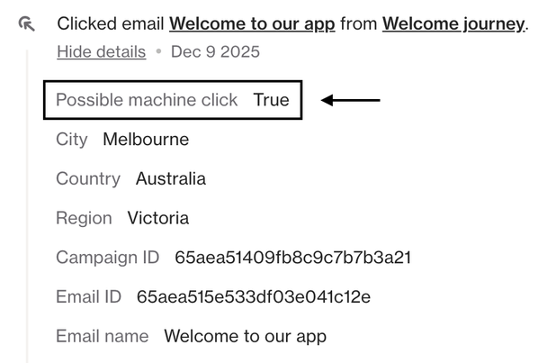 Similar to Opened email tracking, we include an attribute in the Clicked email activity named Possible machine click.