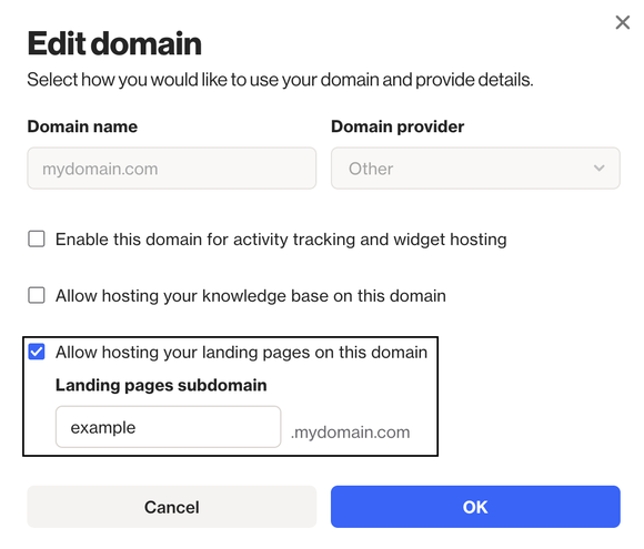 NOTE: To use your own domain, first connect it to your Ortto account. Once your custom domain is set up, you’ll be able to create a subdomain to host your landing pages.