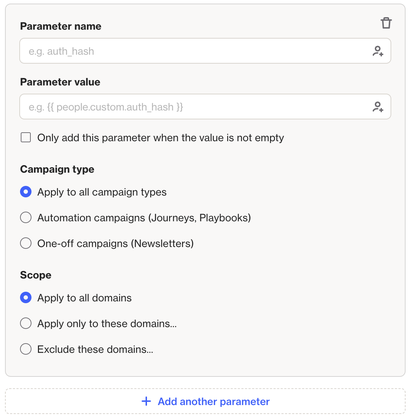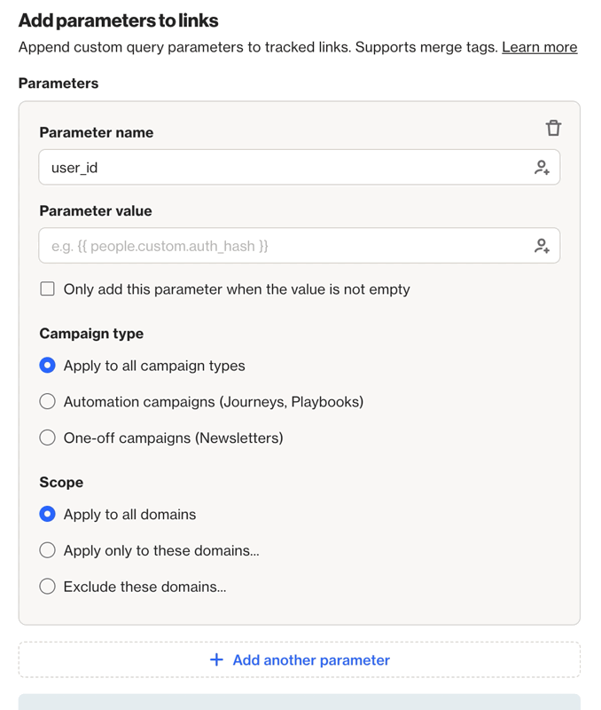 TIP: Both the parameter name and parameter value support merge tags. This means you can, for example, set a static parameter name (e.g., user_id) and have the parameter value dynamically populate for each contact based on their user_id field in the CDP.
