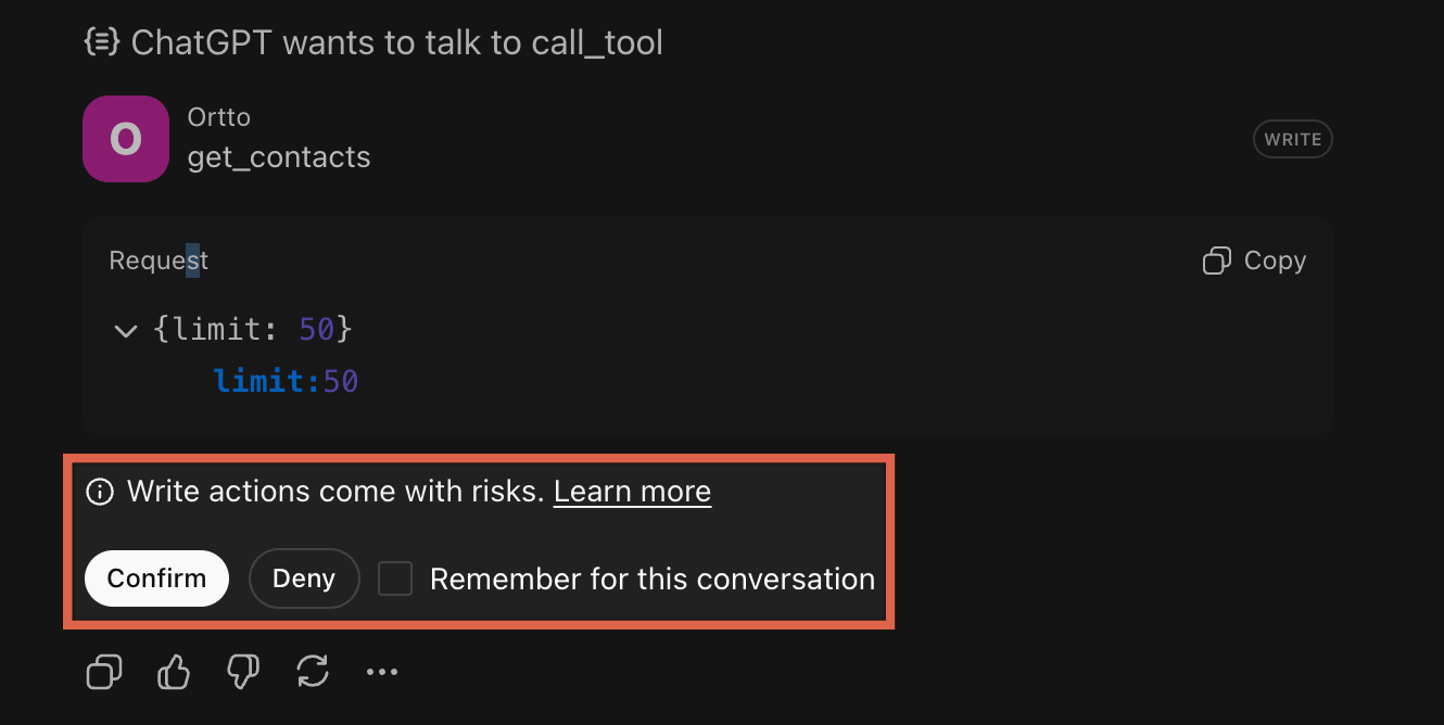 NOTE: While ChatGPT does not currently allow granular permission control for individual actions, note that our MCP intentionally does not provide tools/actions that allow deletion.
