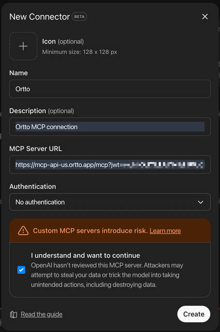 To connect ChatGPT to Ortto’s MCP, follow the steps below. These instructions were accurate at the time of writing, but ChatGPT's interface may change over time. For the most current information, we recommend referring to their official documentation.