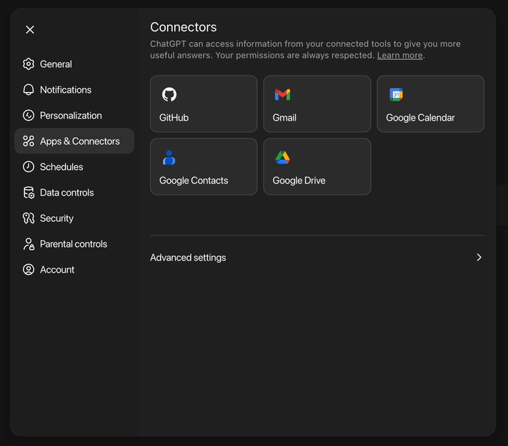 1. Go to ChatGPT > Settings > Apps & Connectors.