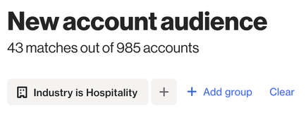 2. Use filters to find the segment of accounts you want to save as an audience. Note that accounts who meet this filter criteria will be added to the audience immediately and anyone that matches in the future will also enter.