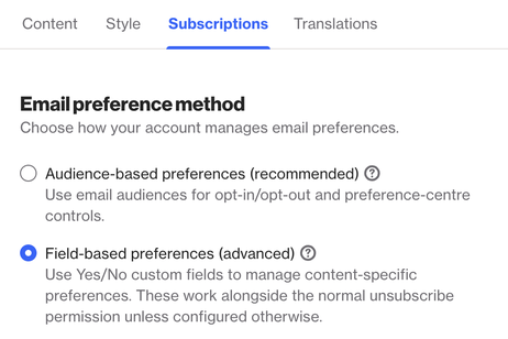 Using fields provides greater flexibility when subscription preferences are controlled outside of Ortto or need to stay in sync with external systems.