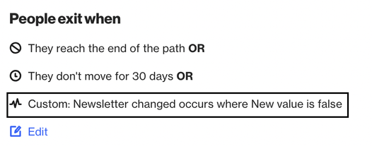 With this in mind, you can set an exit criteria so contacts automatically leave the journey when any of the relevant field(s) change, as shown in the example below.
