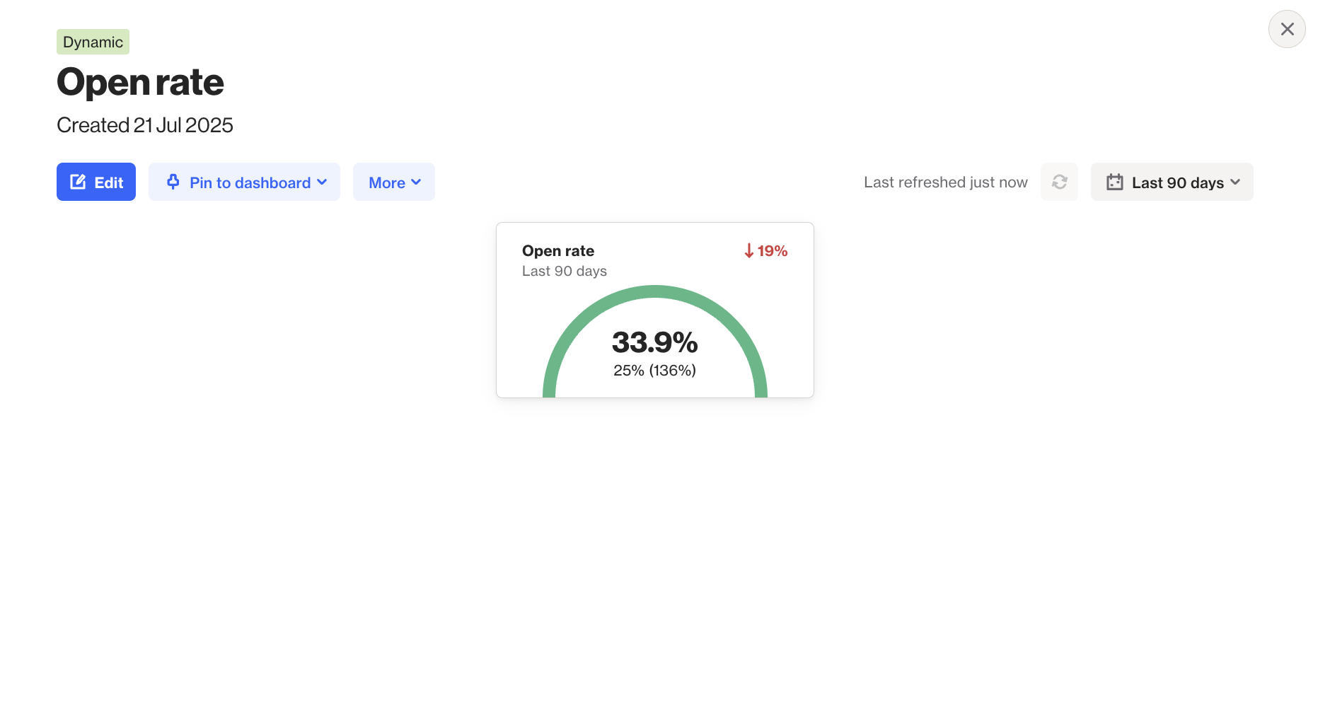 Example: The metric report shows an open rate of 33.9% over the last 90 days. This represents a 19% decrease compared to the previous 90-day period. The goal for this metric is 25%, and the current value exceeds that goal by 136%.