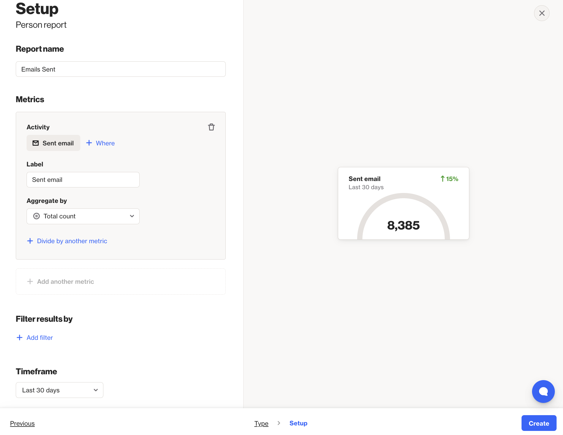 Add metric / Add another metric | Select the activity, contact field, or account field to use as a metric in the report. Learn more about field-based reports. |