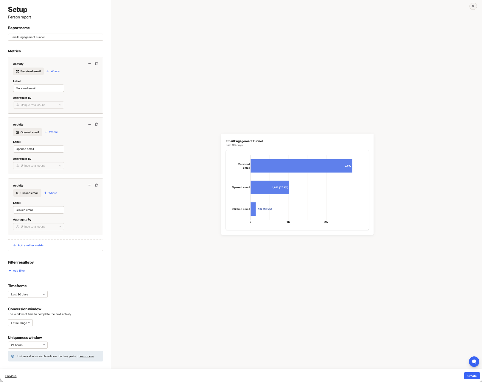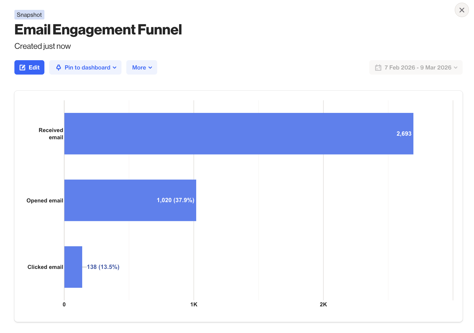 EX: This report shows that 2,693 contacts received an email in the last 30 days. Of those contacts, 1,020 opened the email, representing 37.9% of the contacts in the first step. Finally, 138 contacts clicked the email, which is 13.5% of those who opened it in the previous step.