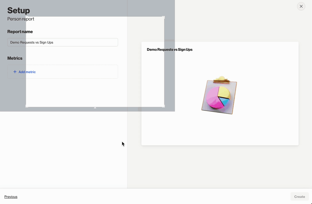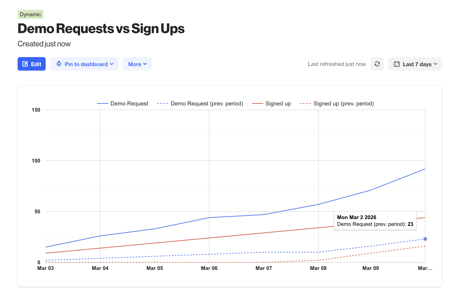 The dashed lines show the previous period, allowing you to compare how activity has changed. In this case, both demo requests and sign-ups are higher than the previous period, indicating increased interest and conversions.