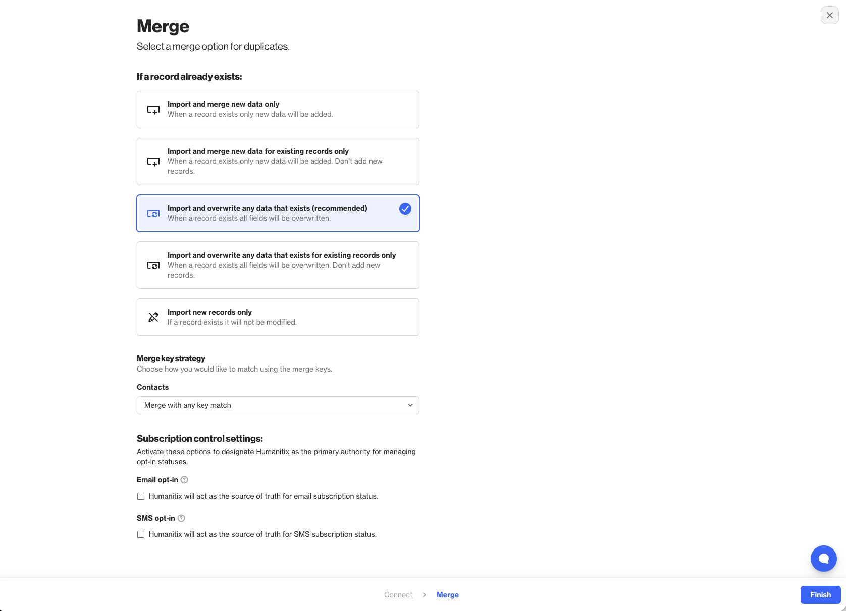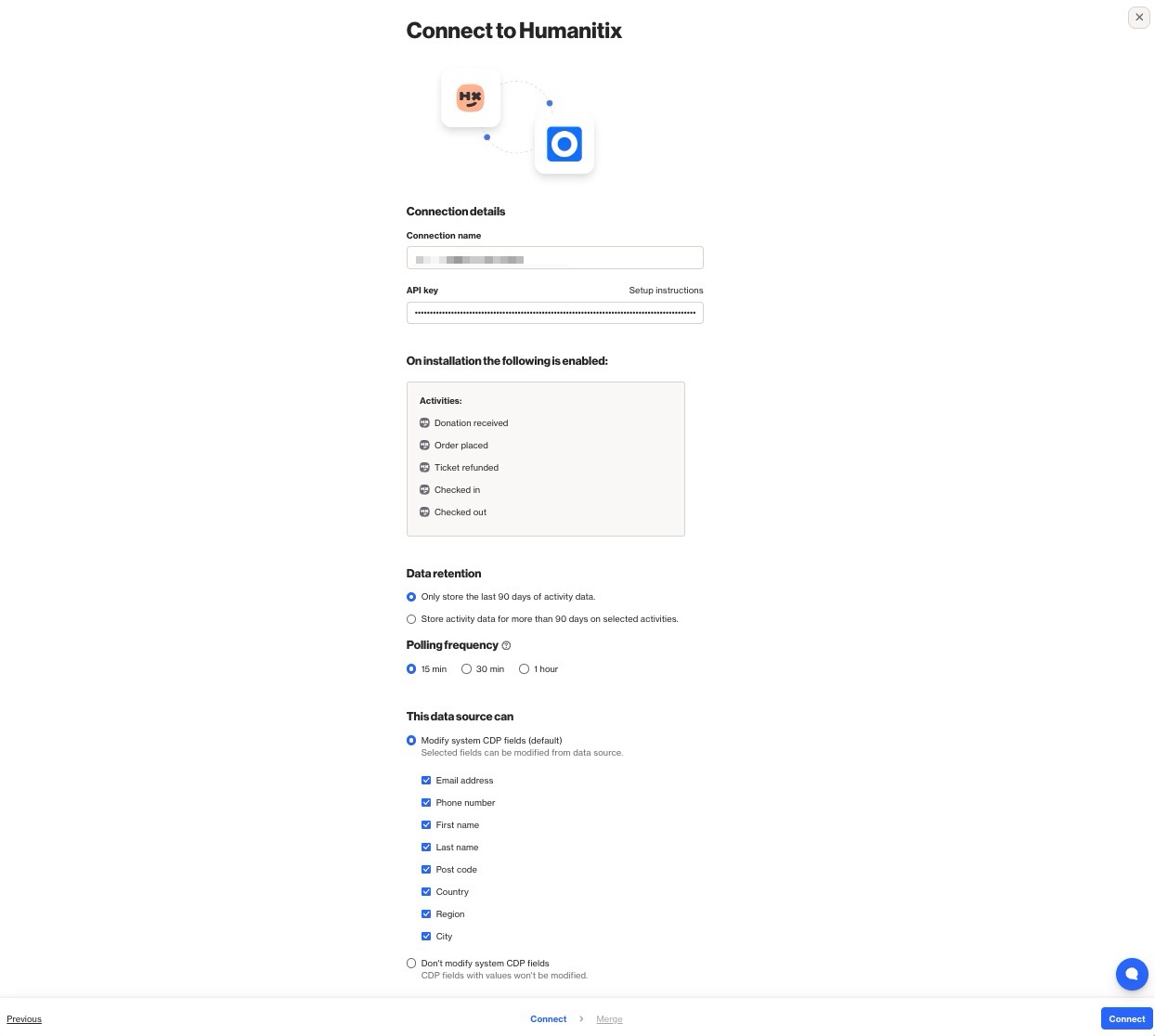Connect step of Humanitix integration wizard. - On the Merge page, select the appropriate strategy by which contact data is merged from Humanitix into your Ortto’s CDP. Learn more about data source merge strategies.