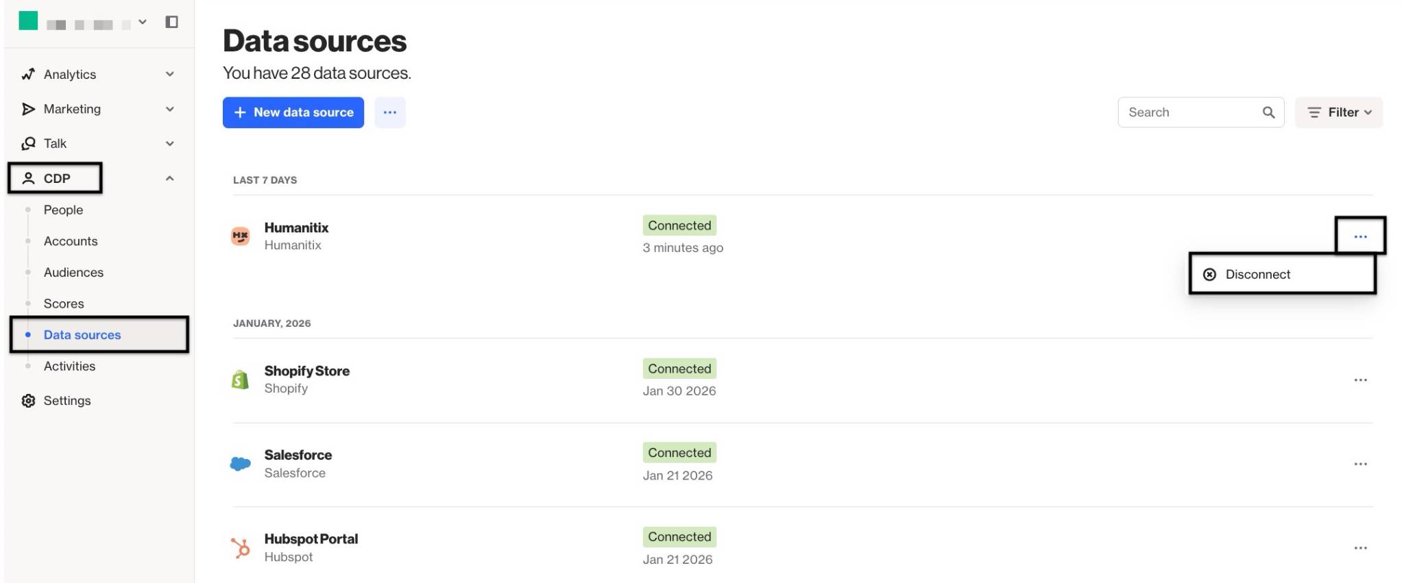 - Click CDP > Data sources > + New data source.