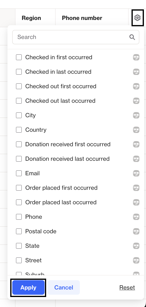 Customize your CDP field visibility and add Humanitix fields by clicking the cog icon, then select or clear the fields you want to show or hide. Humanitix fields are indicated with the small Humanitix icon.
