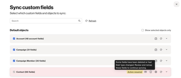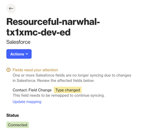 The message will display: Fields need your attention: One or more Salesforce fields are no longer syncing due to changes in Salesforce. Review the affected fields below.