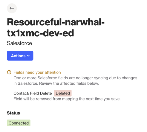 The message on your Salesforce data source connection will include the object name and the field that is no longer available. For example, if a field called "Field Deleted" has been removed, the banner will display: Contact: Field Deleted.