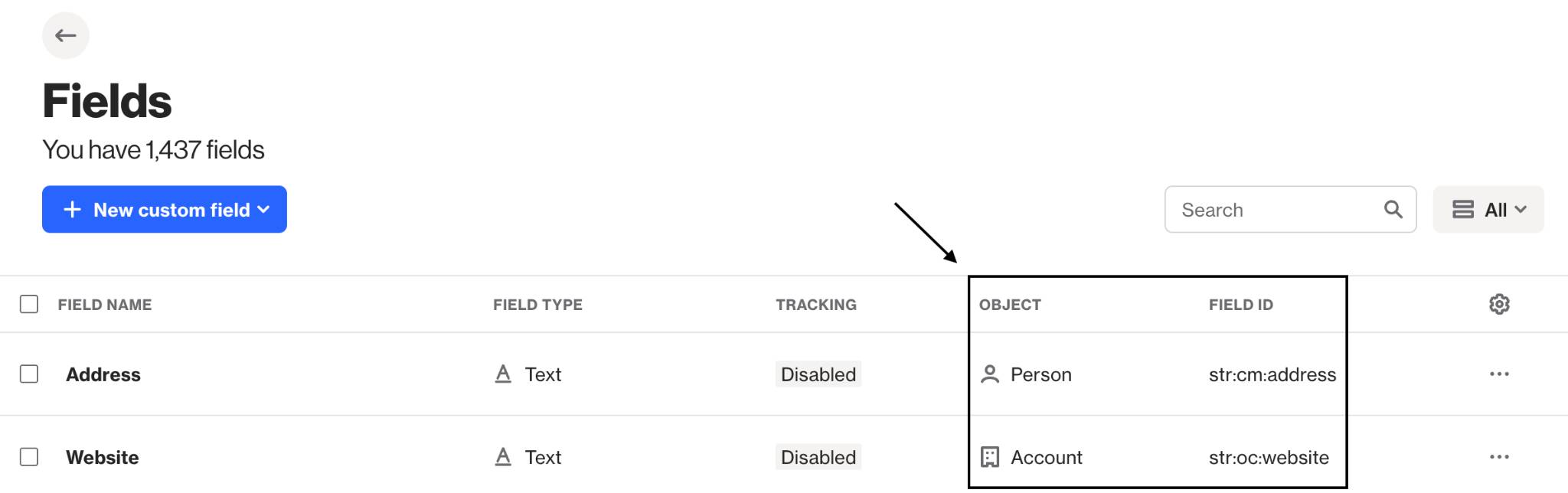 TIP: The field IDs for both persons and accounts can be found on the Fields fields page of your account:
