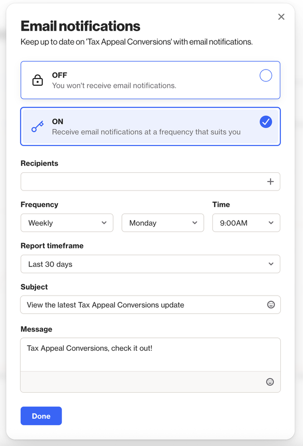 - In the report view, select More > Notifications > Email.