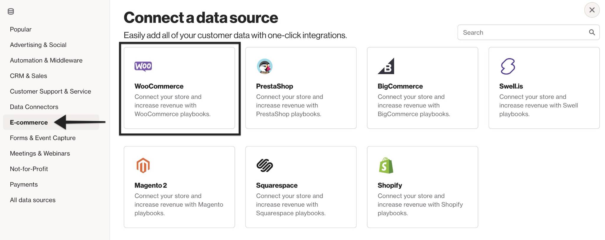 To access the PresetaShopa data source, go to CDP > Data sources > + New data source > E-commerce > WooCommerce.