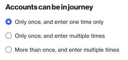 - Only once, and enter multiple times: An Account can be in the journey once at a time. It must exit the journey before it can re-enter the same journey.