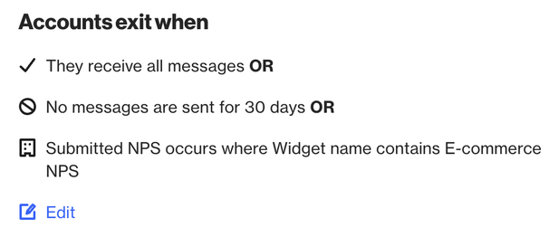 TIP: Since this is an Account journey, conditions are checked against the Account profile, not individual Contacts. If the Account meets the condition, the entire Account and all its Contacts will exit the journey.